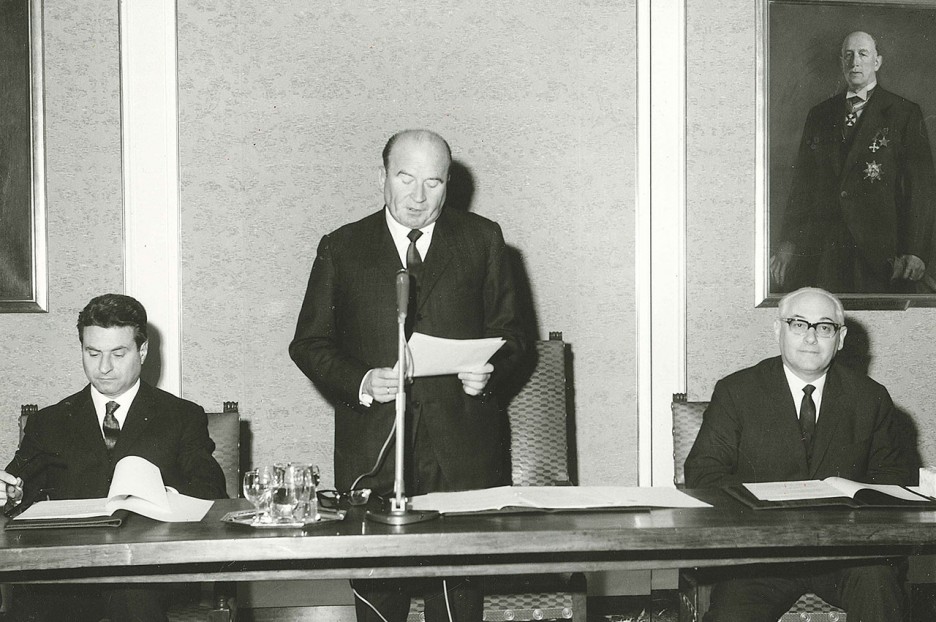 14.11.1968. Im Stehen Präsident RA Dr. Brandstätter mit dem Vizepräsident Dr. Giulini und dem Generaldirektor, Dr. Laszloczky