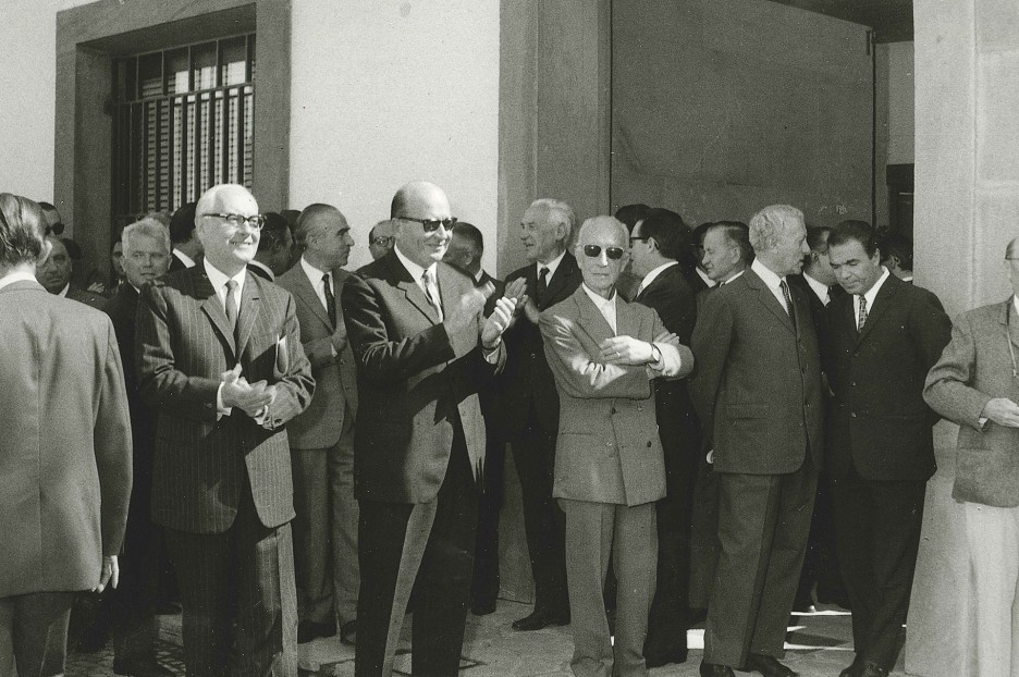 Von links: Dr. Laszloczky und RA Dr. Brandstätter. Hinten im Profil das Mitglied und Altpräsident von Braitenberg. Vorne die Mitglieder RA Pasquali und Herr Spadafora und Dr. Fravolini, Aufsichtsrat der Sparkasse