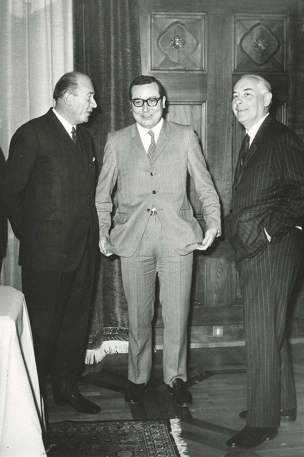12.11.1970. Im Zentrum der Bürgermeister von Bozen Dr. Bolognini zwischen dem Präsidenten und dem Generaldirektor der Sparkasse