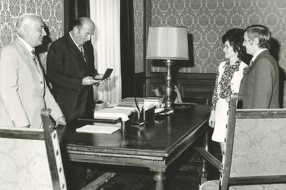 24.08.1971. Der Präsident der Sparkasse, RA Dr. Brandstätter feiert offiziell mit einem jungen Paar die Unterzeichnung des 1.000en konventionierten Baudarlehen