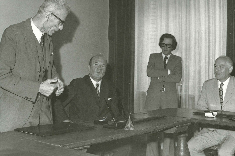 22.06.1972. Von links: der Landeshauptmann Dr. Silvius Magnago, Präsidend Dr. Brandsätter, der Leiter der Kreditabteilung, Herr Bergamaschi und Generaldirektor Dr. Laszloczky