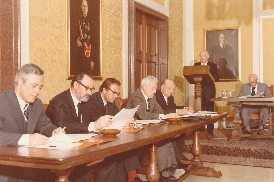 29.03.1974. Von links: Rag. Deutsch, Vize-Generaldirektor, die Aufsichtsräte RA Lutz, Dr. Fravolini, Dr. Mutschlechner, Verwaltungsrat Ing. Ferrari, der Generaldirektor (stehend) und Alt-Verwaltungsrat Komm. Kettmeir