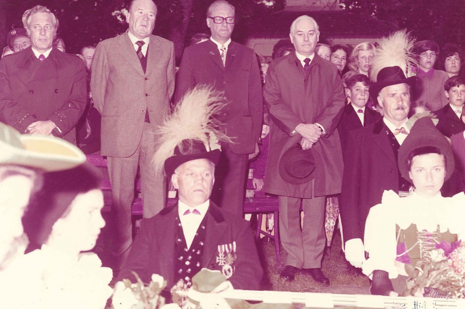 Kastelruth, 09.06.1974. Stehend von links: Rag. Deutsch, Vize-Generaldirektor, RA Dr. Brandstätter, Präsident, On. Karl Mitterdorfer und Dr. Laszoczky, Generaldirektor